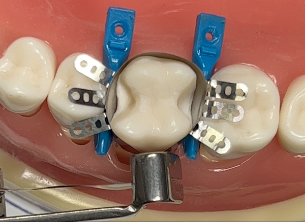Multiple long tabs on the proximal sides can be, optionally, tacked to adjacent teeth to overcome the inward force created by band tightening. This guarantees that the contacts are tight.