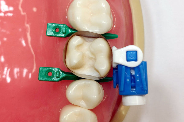 The tabbed QuickConnect Anatomy Band has special "Tight-Contact-Tabs" that are pulled with a dental probe while light-curing to ensure the matrix band is in contact with adjacent teeth, guaranteeing tight contacts. Alternatively, they can be temporarily bonded to the occlusal surfaces of the adjacent teeth using dental bond and flowable composite. This second option can save valuable time by allowing you to fill and cure both the mesial and distal boxes simultaneously.